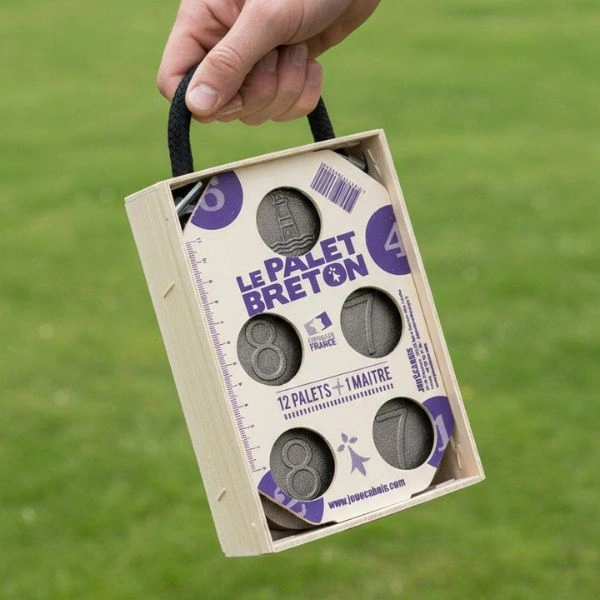 Vous recevez : Une boite de rangement pour palets bretons avec 12 palets et un maître réglementaire ainsi qu’une réglette de mesure de 11cm.