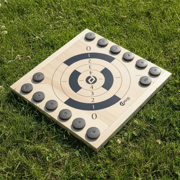 Vous recevez : Une planche de palet breton David avec cible de tire accompagnée de 12 palets et d’un maître en Fonte